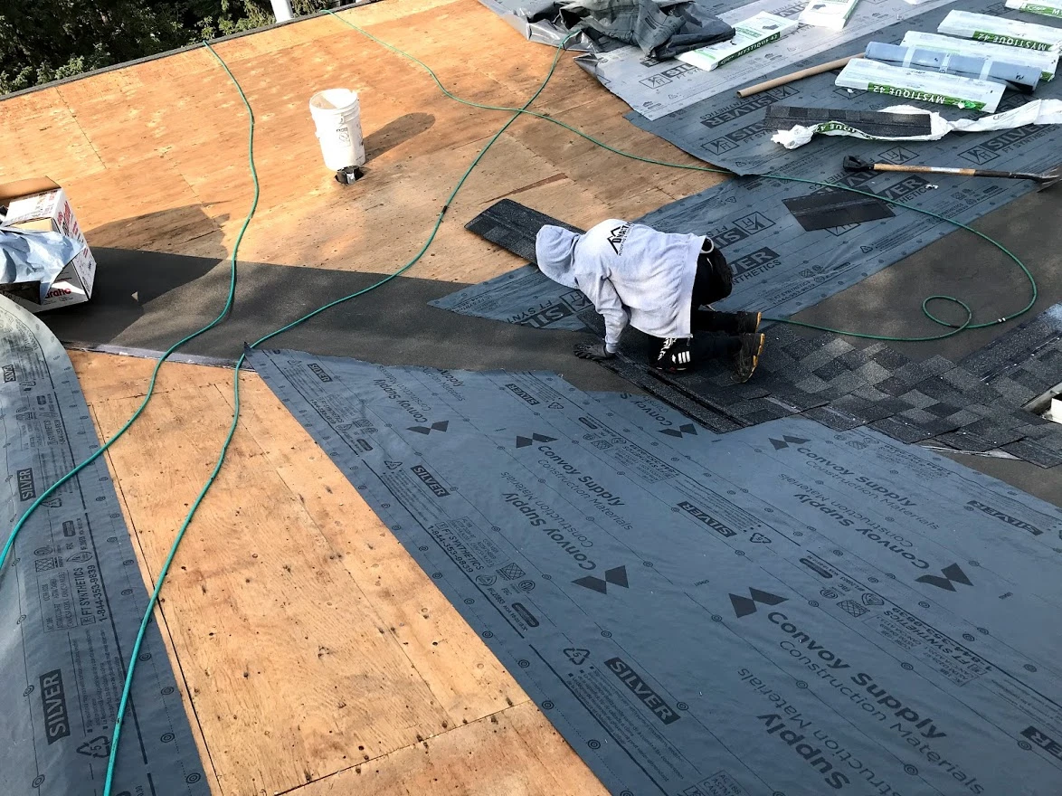 We enhance your roof's durability and prevent staple penetrations by using shingle manufacturer-recommended synthetic underlayment, covering the entire roof for added protection.
